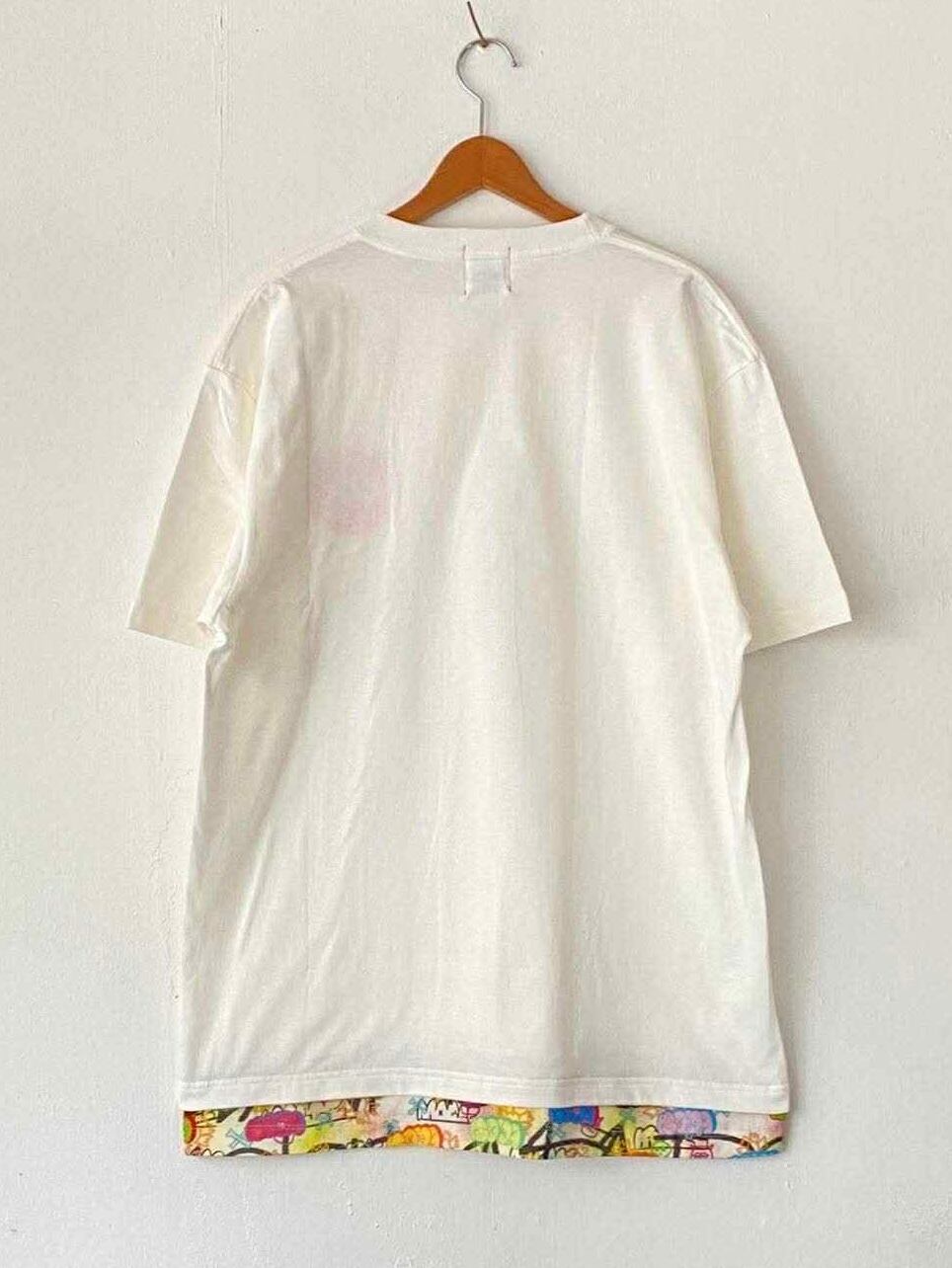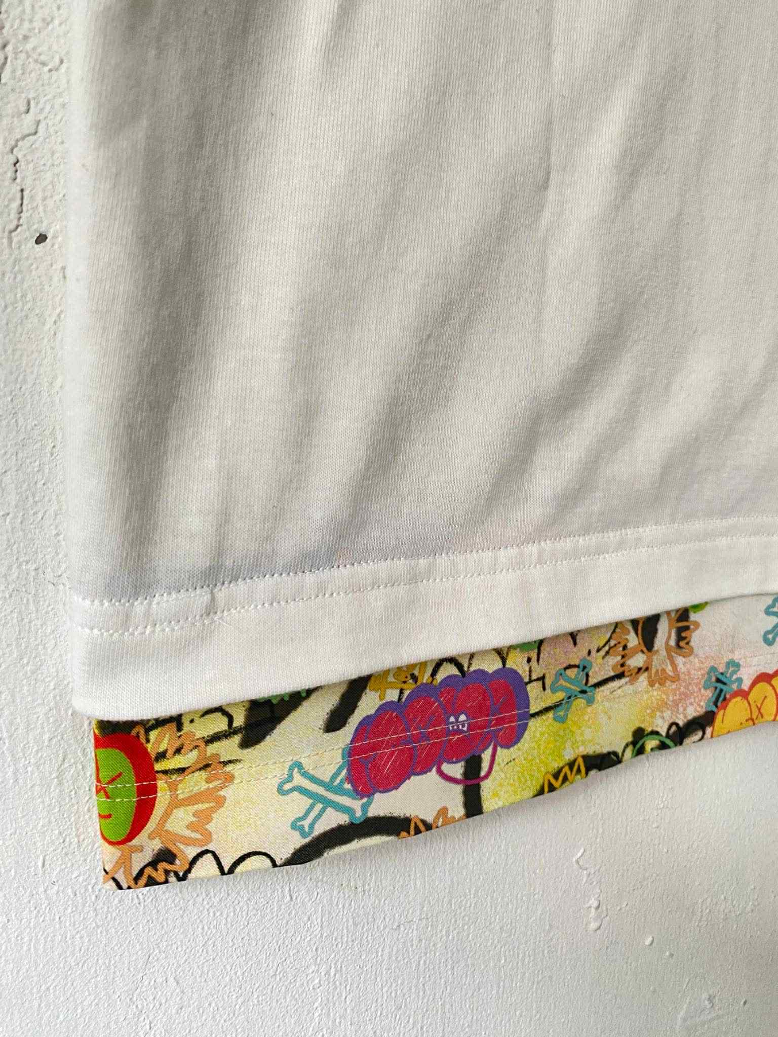 裾にはグラフィティパターンのオリジナル生地をつけた、重ね着感も楽しめるアイテムです。
